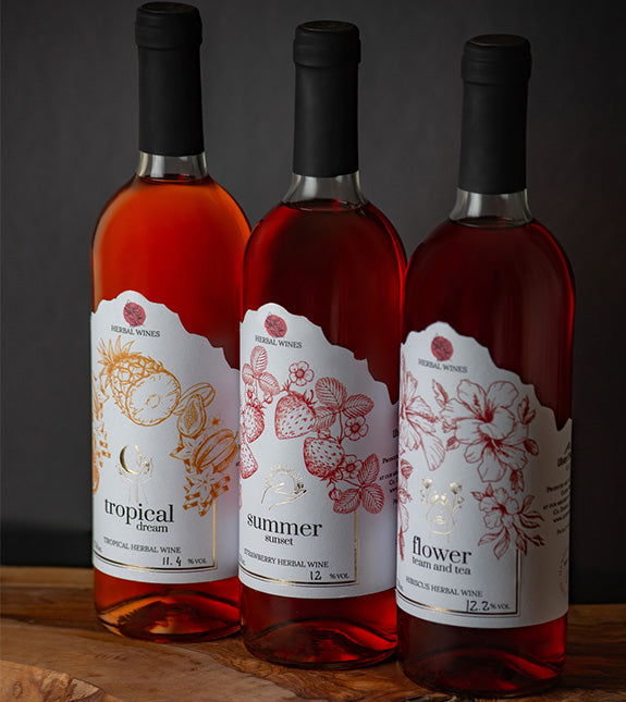 Herbal wines are refreshing, aromatic drinks made by fermenting blends of dried herbs, plants, fruits, and botanicals. They share the light, crisp character of a rosé — but unlike rosé, they are not made from grapes.